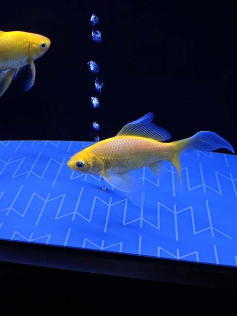 ブルーナイトアクアリウム時に撮影した写真ですが、青い光に尻尾の黄色の部分が強く反射している姿がとても綺麗です!