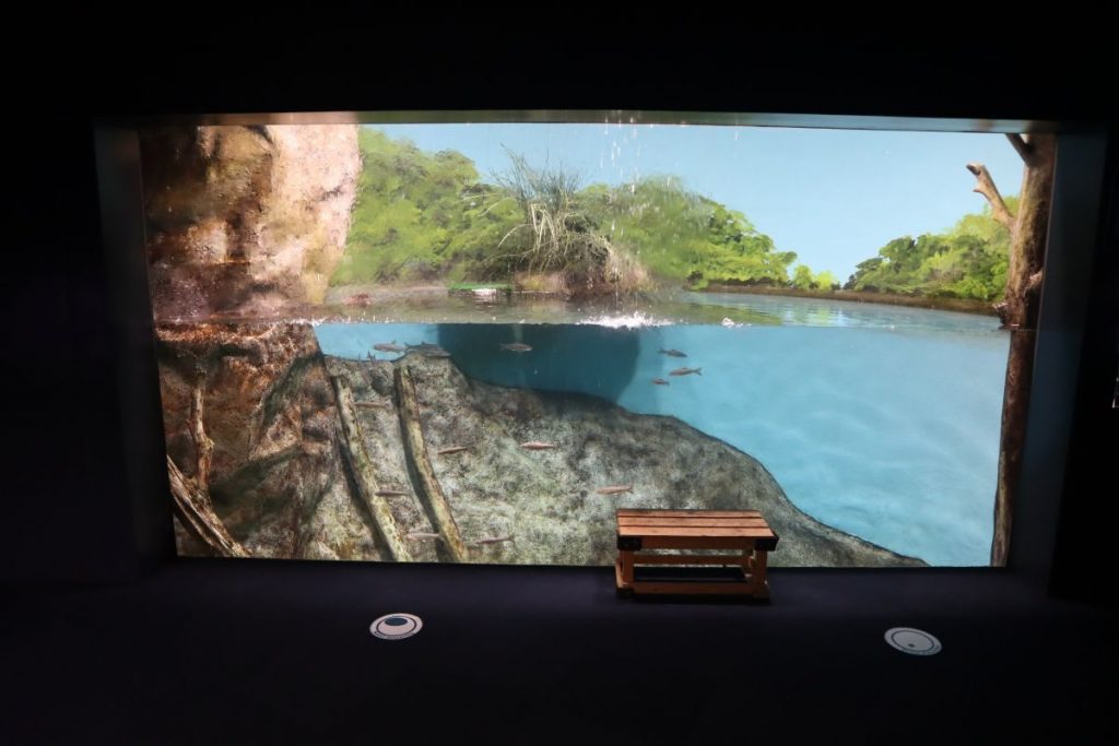 透き通った綺麗な水槽が並んでおり、水槽ごとに上流〜下流に分けられて生き物が展示されています。